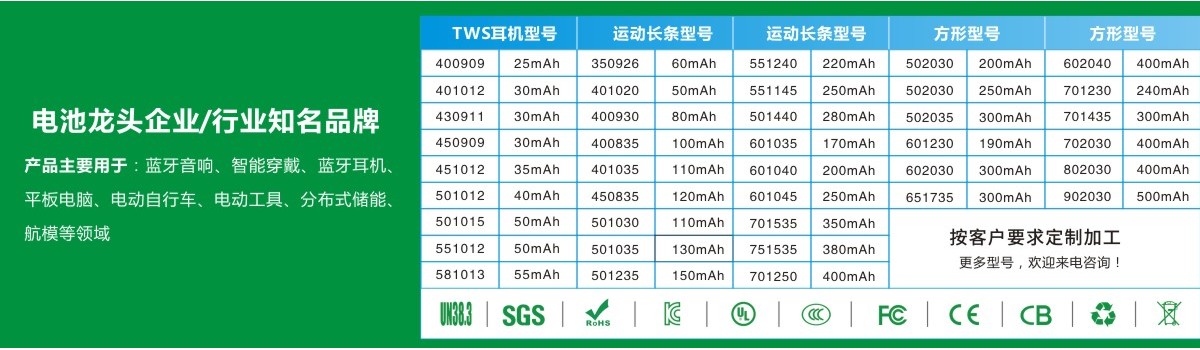廣東航電鋰能科技有限公司,是一家主要經營鋰電池的生產型企業。廣東航電鋰能科技有限公司始終堅持以人為本,以創新為發展動力,秉承“信譽第一,質量至上”的經營理念,爭創市場一流品牌。公司的主營產品電池以品種齊全、價格合理的優勢,在消費者當中享有較高的地位,贏得了廣大客戶的一致好評。 公司主營產品有:鋰電池,動力鋰電池,耐高溫電池,聚合物電池,圓柱鋰電池。產品主要用于:藍牙音響、智能穿戴、藍牙耳機、平板電腦、電動自行車、電動工具、分布式儲能、航模等領域等。 志存高遠,銳意進取。在機遇與挑戰面前,廣東航電鋰能科技有限公司將不斷求索,愿與所有的伙伴一路同行,一同成就未來,共建偉業!